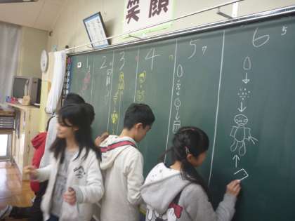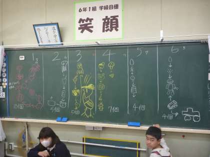 6年 お楽しみ会 その1 公開日 2016/12/20 更新日 2016/12/20 6年生の様子 12/20(水) 以前,「お楽しみ会を開こう」という議題で,話合い活動を行いました。今日の午後がお楽しみ会でした。 前半は【絵しりとり】でした。6チームに分かれ,計画委員会が作ってくれたメダルを争いました。子供たちは自分の番になると,ドキドキしながら絵を描いていました。