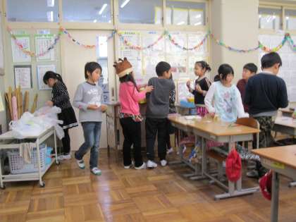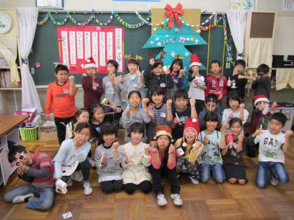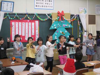 クリスマス会では,休み時間に練習していた「恋ダンス」をグループ発表をしてくれました。また,みんなで作ったおもちゃを袋に詰めて「プレゼント交換」を行いました。ビンゴゲームしてからくじを引き,プレゼントを交換しました。今年の締めくくりを,みんなで楽しく過ごすことができました。