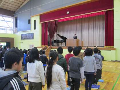 今日から,3学期がスタートし,1時間目に体育館で始業式を行いました。全員で元気よく校歌を歌いました。2年生の児童が代表で頑張りたいことを発表しました。式では,全員が名札を付け,楽しい学校生活を送り始めました。
