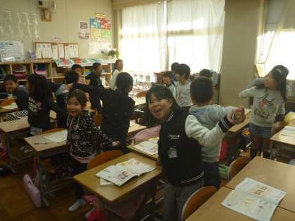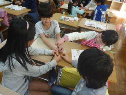 音楽の学習で「わらべうた」を聴いたり,歌ったりしました。「ずいずい ずっころばし」では,グループで手を出し合って,みんなでリズムを打ちながら遊びました。また,「あんたがた どこさ」や「なべなべ そこぬけ」も一緒に歌いながら,遊びました。