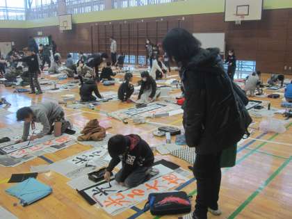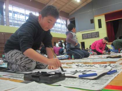 今日は新春書き初め会です。体育館にそろって一筆一筆丁寧に書きました。おうちの方にもきていただき、張り切って書いていました。