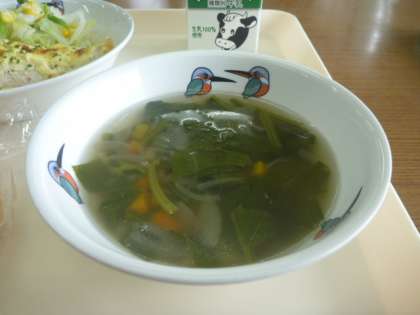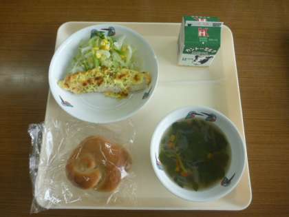 今日の献立は,こめパン,サケのチーズ焼き,アスパラのサラダ,オニオンスープでした。