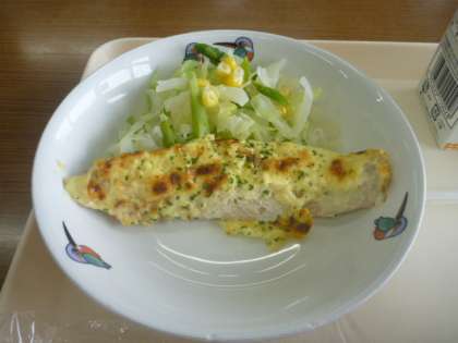 サケのチーズ焼きは,サケの切り身に,タルタルソースをかけ,チーズをのせてオーブンで焼いたものです。なかなか手間のかかるメニューですが,身もくずれることなくきれいにおいしくいただくことが出来ました。
