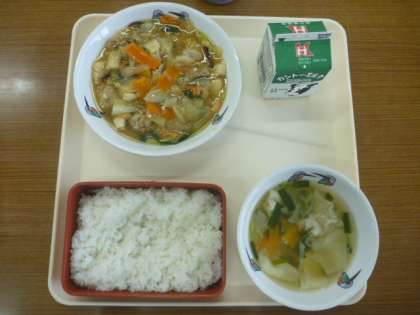 今日のメニューは,ごはん,八宝菜,ワンタンスープ,ミルク です。