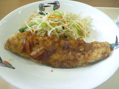 あじの南蛮漬けは,ころもをつけてさっとあげたものに,甘辛いたれをからめた一品です。食欲のでないこんな暑い時期に,ごはんに合うおかずです。添え物のビーフン炒めも炒めた香ばしさが,食欲をそそります。