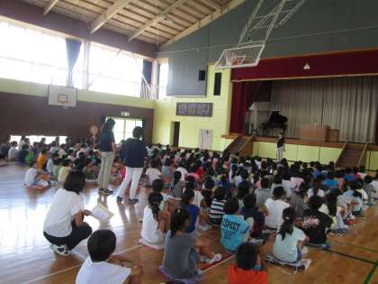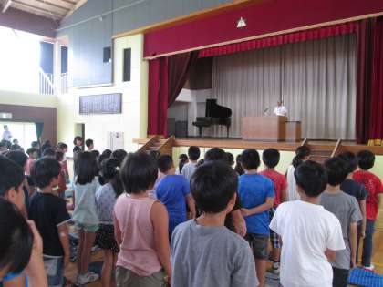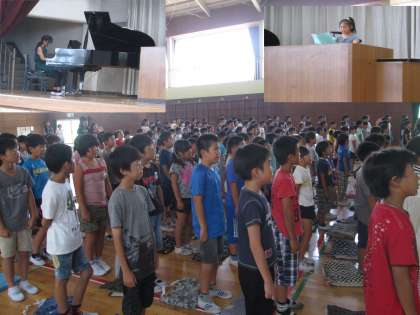 3校時に体育館で,1学期の終業式を行いました。全員で校歌を歌い,5年生の児童代表者が1学期に頑張ったことを発表してくれました。生徒指導担当の先生からは,夏休みに気をつけてほしいことのお話を聞きました。