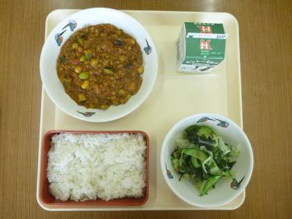 今日の献立は,むぎごはん,ドライカレー,かいそうサラダ(ごまドレッシング)でした。