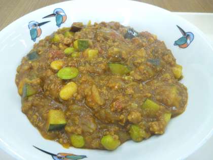 ドライカレーは,ズッキーニ,ナス,えだまめ,にんにく,しょうが,トマトがたっぷり入っています。少しスパイシーで暑い夏には,ぴったりのスタミナバツグンのカレーでした。