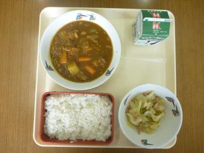 今日の献立は,むぎごはん,カレー,キャベツとエリンギのソテーです。
