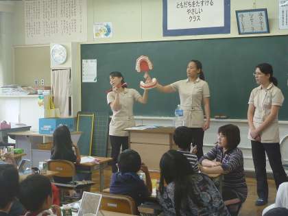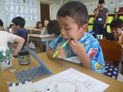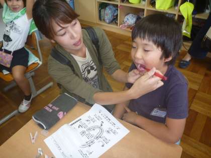 今日は,親子歯みがき教室でした。歯科衛生士さんの指導のもと,正しい歯の磨き方などを教えていただきました。また,染め出しをして,磨き残しをチェックしたり,お家の方に仕上げ磨きをしてもらったり,親子で確認しながら活動しました。