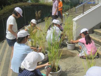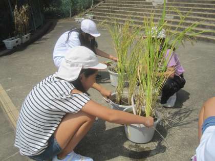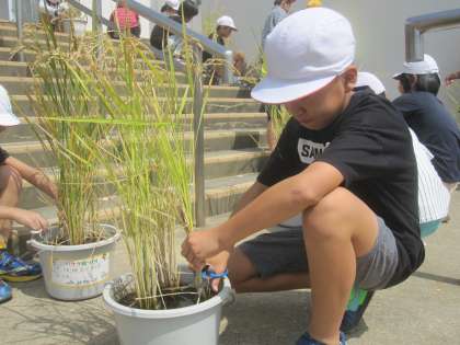 5年 稲刈りをしました 公開日 2017/09/15 更新日 2017/09/15 5年生の様子 9月14日(木) 総合の時間に稲刈りをしました。収穫した稲を大事に束ね、しばらく干しておきます。 家庭科の調理実習でご飯を炊くので、脱穀をして一緒に炊いてみたいと思います。