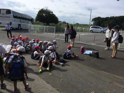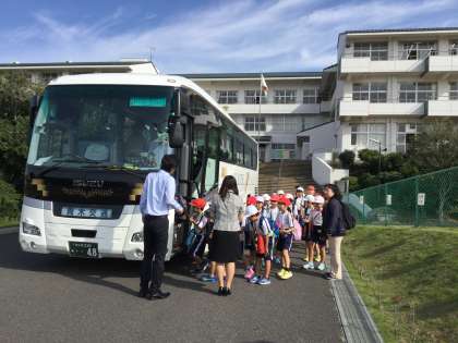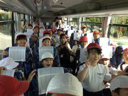 今日は、2年生の校外学習の日です。出発式を行い、バスに乗りました。アンデルセン公園に向かって出発です。
