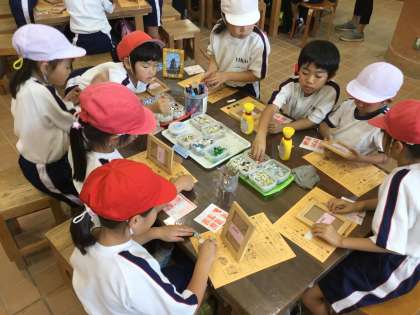 タイルアートの体験学習です。完成後には、素晴らしい写真立てができる予定です。みんな、上手に作ってね!