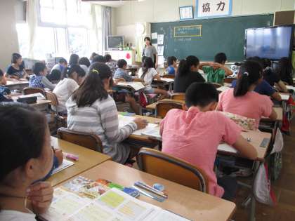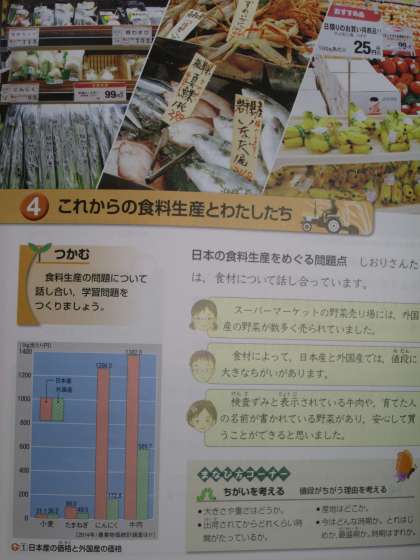 社会の授業では,「これからの食料生産とわたしたち」の単元を学習しています。今日の学習課題は,「日本の食料生産を巡る問題について」です。日本で作られた物と海外から輸入された食料の値段の違い等,子供たちは様々な食料生産の特色や役割,食料確保の現状,運輸の働きを理解します。
