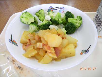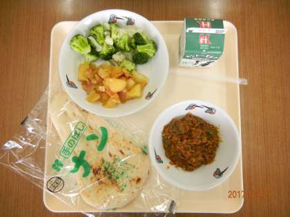 今日の献立は,ナン,キーマカレー,じゃがいものサブジ,花野菜のサラダ でした。