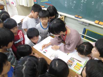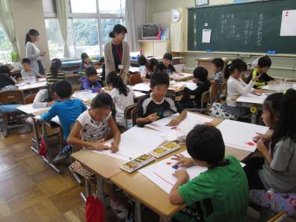 今日は,東京芸術大学の院生2名が来校し,絵画指導をしてくれました。子供たちは,クレパスの使い方を教えてもらいました。