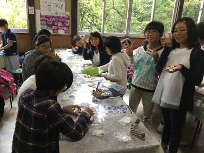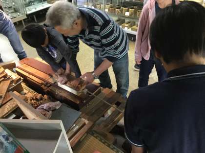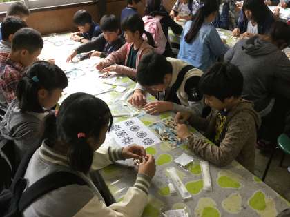 寄木細工で作品づくりです。みんな上手に作っています。また、寄木の紙づくりも体験しました。