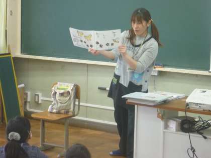 本の内容は,文字で描いた絵のお話でした。子供たちは「た・い・よ・う」のひらがなで描かれた太陽や,「ま・ん・ぼ・う」で描かれたマンボウなどに驚きの声を上げていました。