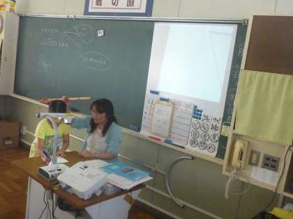 子供たちの興味が大変あったため,本日の図工の時間で,文字で書いた絵に挑戦してみました。3枚目の写真は自分で描いた絵を友達に発表している最中です。プロジェクターで工夫した点を説明したり,みんなで隠れている文字を探す活動をしたりしました。