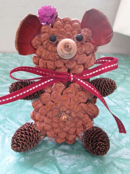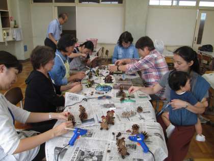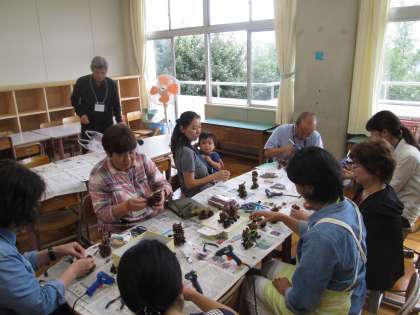 11月3日のどんぐりっこ祭りに向けて,たくさんの方々が準備に携わってくれています。今日は,NPO取手の方々や保護者のボランティアの方に松ぼっくりを活用した可愛いクマの作品を作っていただきました。