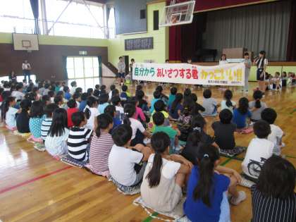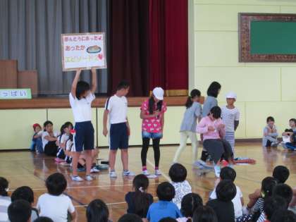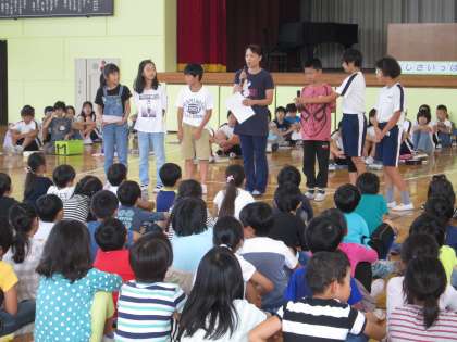 昼休み,体育館で「やさしさいっぱい集会」を行いました。委員会の児童から,思いやりや優しさについて発表しました。