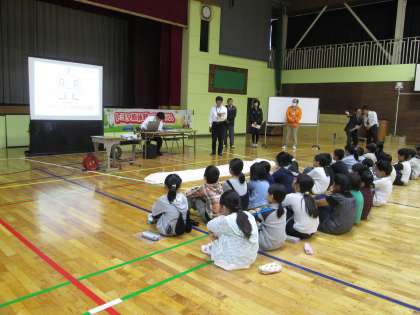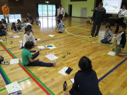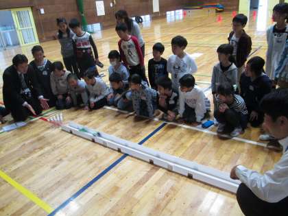 体育館で出張授業「トヨタ原体験プログラム」を行いました。空気エンジンカーを使って,空気の性質やエンジンのしくみを学び,空気エンジンのパワーのすごさ,クルマにおけるコントロールの大切さを体感しました。