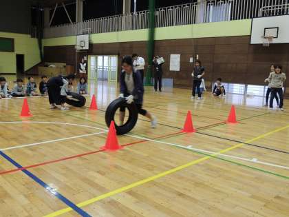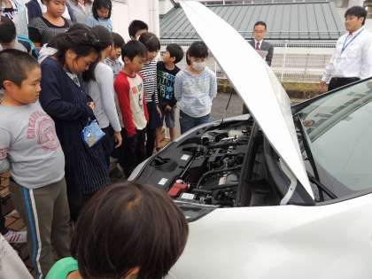 バンパーを開けてエンジンの音を聞いた時には「初めてエンジンが動いてるのを見た。」と驚いている子供がいました。その他にもブレーキの原理をタイヤリレーで体験するなど,終始大盛り上がりの授業となりました。