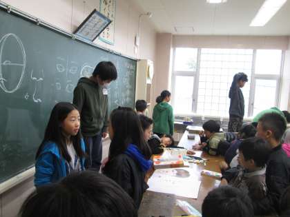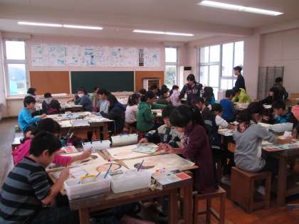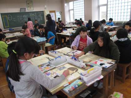 今日の図工の時間は,東京芸術大学の先生に来ていただき,子供たちに絵画の指導をしてもらいました。子供たちは,絵の具を使い方を教えてもらい,人物画の色染を行いました。