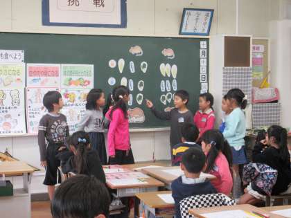 永山小の鈴木先生に来校していただき,食育指導を行いました。今回は「好き嫌いせず何でも食べよう」という内容で,ご指導いただきました。食べ物は,栄養によって3つのグループに分けられることや,バランス良く食べないとうまく栄養を取り入れることが出来ないことなどを教えていただきました。