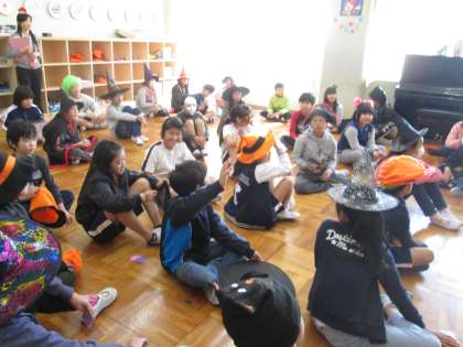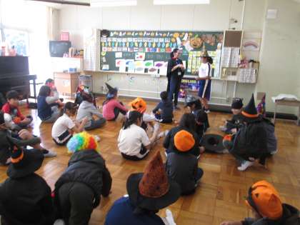 10月31日は,ハロウィーンの日です。海外では,ハロウィーンの日に,仮装をして「トリック・オア・トリート」と言って,お菓子をもらいます。今日の授業では,海外の文化を知りながら,ハロウィーンの仮装をして,楽しく子供たちは外国語活動を行いました。