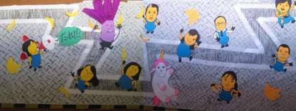 どんぐりっこ祭りでフォレストの皆さんにアトラクションで製作していただいた職員の似顔絵を2Fの東棟と西棟の間の廊下壁面に掲示しました。
