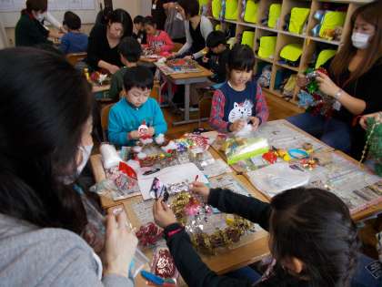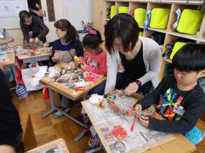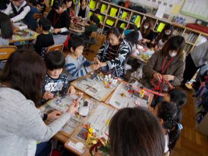 今日は,1学期から育てたアサガオのつるを使って,リースづくりをしました。子供たちは,リースづくりの設計図をもとに,おうちの方と楽しく制作することができました。持ってきた材料を使って,それぞれ素敵なリースが出来上がりました。早く持ち帰りたいとも言っていました。笑顔溢れる楽しい時間となりました。