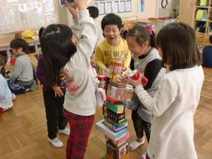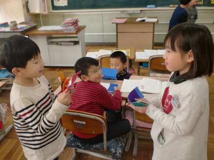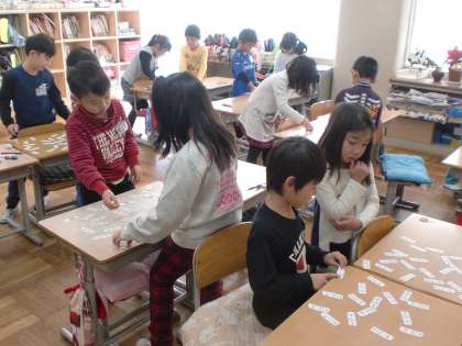 図工では,箱を積み上げたり,つなげたりして,タワーやジェットコースターなど,思い思いの形を作りました。一人で作ったり,グループで作ったりと,楽しく活動することができました。国語では,「好きな物クイズ」を出し合いました。丁寧な言葉遣いを意識して活動することができました。算数では,引き算カードを使って,ペア学習を行いました。