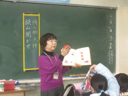 今日は読み聞かせの日です。今日は2冊読んでもらいました。一冊は野菜の本。もう一冊は「りんごかもしれない?」りんごが登場して子供たちもびっくりです。楽しい時間でした。