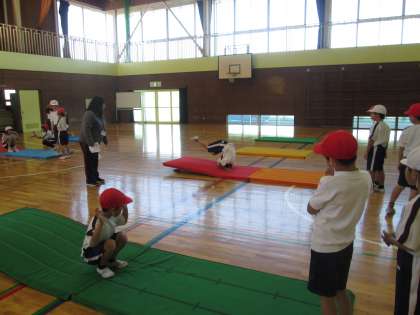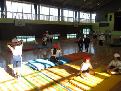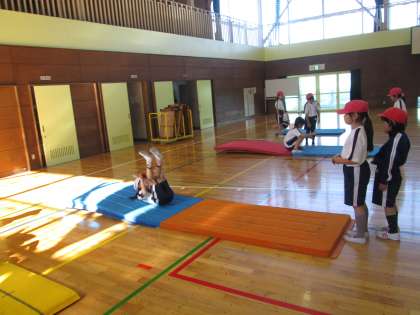 2年生の体育は,マット運動を行っています。今日は,後転の練習を行いました。回転の練習として,マットで坂を作り,回転の勢いをつけ練習をしました。