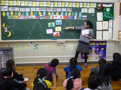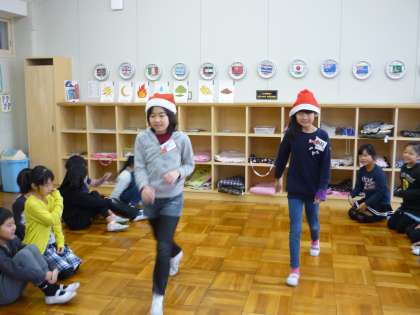 外国語活動が行われました。もうすぐクリスマスなので,今回はクリスマスツリーを完成させるゲームを取り入れながら,クリスマスツリーに飾る物の名前を英語で発音しました。サンタさんの帽子をバトン代わりにし,楽しく活動しました。