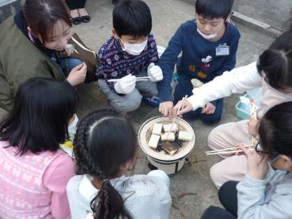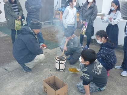 「環境NPOとりで」の方にご指導いただきながら,マッチをする所から始めました。マッチを使うのが初めてという子も多く,火をつけるだけで大騒ぎでしたが,みんな一生懸命に取り組んでいました。授業参観ということもあり,おうちの方にもお手伝いいただきながら,楽しく行うことができました。火がおこせた後には,お餅を焼いておいしくいただきました。「お餅1つ焼くだけでも昔の人たちは大変で,時間がかかったんだな」と昔のくらしの大変さを実感していました。