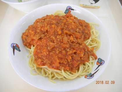 給食室の調理員さん自家製のミートソースは,トマトたっぷりの酸味のきいた素朴な味です。