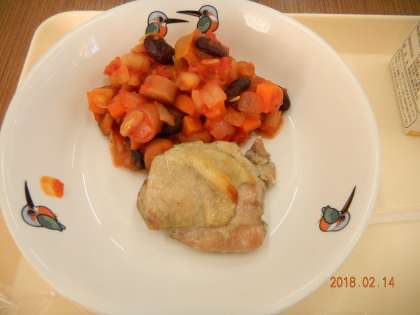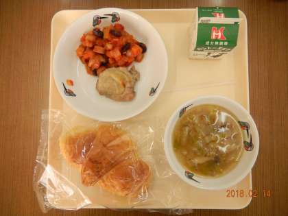 今日の献立は, クロワッサン とりにくの香草焼き カスレ はくさいとベーコンのスープ でした。