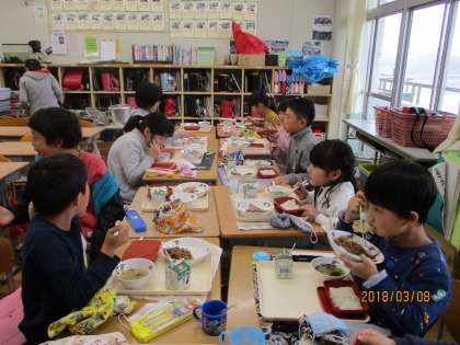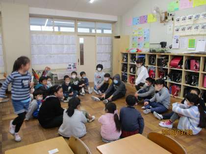 今日は今年度最後の縦割り活動の日でした。縦割りで給食を食べ、昼休みは縦割り遊びました。最後ということで、どの班も6年生にお礼を述べ、1年間お世話になった感謝の気持ちを伝えました。