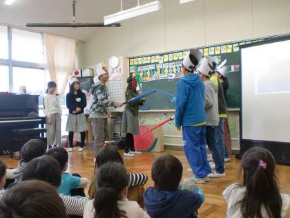1校時は,英語の学習でした。様々なフルーツを英語で発音するゲームを行いました。4校時はコンピュータの学習でした。絵を描いたり,学習ソフトを使ったりして,楽しみました。5校時は,6年生の英語劇「桃太郎」を見せてもらいました。「英語をたくさん話せる6年生はすごい!」と,また1つ,6年生の素晴らしさを感じた1年生でした。