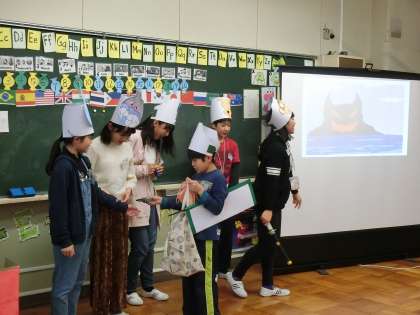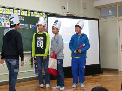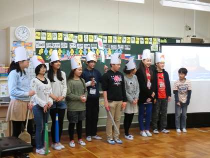 3/9 6年 Peach Boy 公開日 2018/03/12 更新日 2018/03/12 6年生の様子 3/9(金) 英語劇の桃太郎を1年生に披露しました。 オリジナルキャラクターも出てきて,1年生も喜んで見てくれました。 片言の英語ですが,6年生も自信がついたことでしょう。