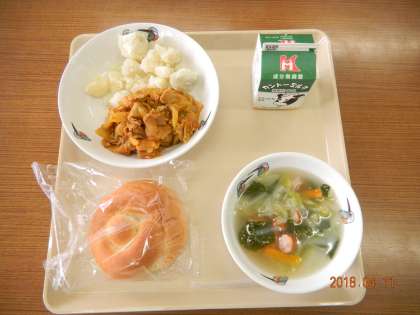 今日の献立は,こめぱん,ぶたにくとセロリのケチャップいため,こふきいも,キャベツのスープでした。