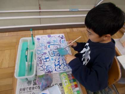 4年生は「わたしの夢もよう」という学習で,様々な模様や形を組み合わせて絵を描きました。最後にスパッタリングにも挑戦し,細やかな飛沫を楽しむことができました。
