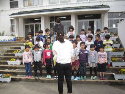 昇降口の前でクラスの写真を撮りました。階段に4列に並びました。段差があるのでちょっと難しかったかな。クラスの写真は昇降口の近くに掲示します。