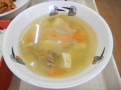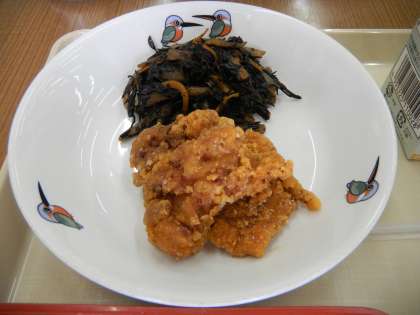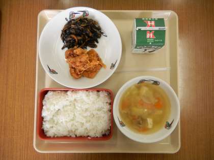 今日の献立は,ごはん,とりのから揚げ,ひじきの炒め煮,とんじる でした。