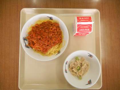 今日のメニューは,スパゲティーミートソース,ダイコンとツナのサラダ でした。