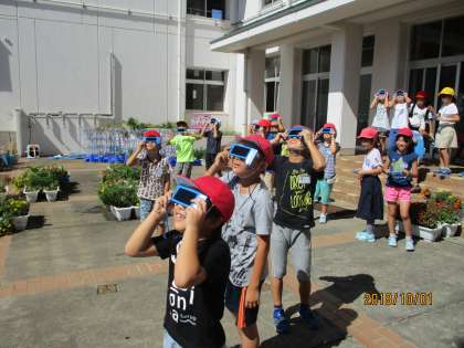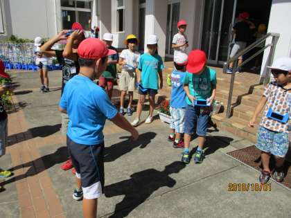台風一過の好天に恵まれ、太陽とかげの観察をしました。遮光板で太陽を観察すると緑色に見えて、みんな「緑だ!緑だ!」と喜んでいました。自分のかげを観察して、太陽と反対側にできることをあらためて実感することができました。