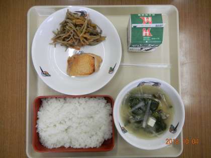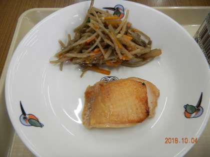 今日の献立は,ごはん,鶏のキジ焼き,きんぴらごぼう,みそ汁 でした。
