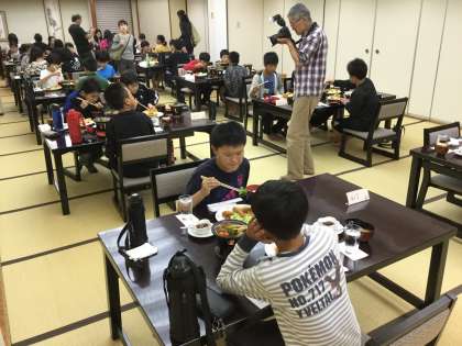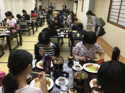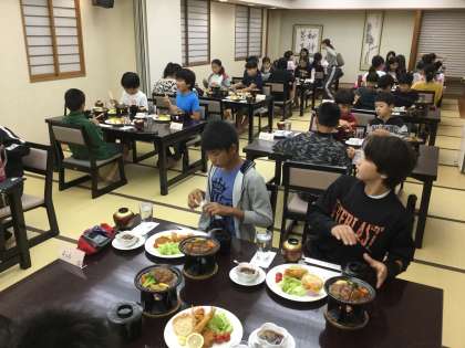 お風呂に入った後は、 夕食の時間です。みんなモリモリ食べています。